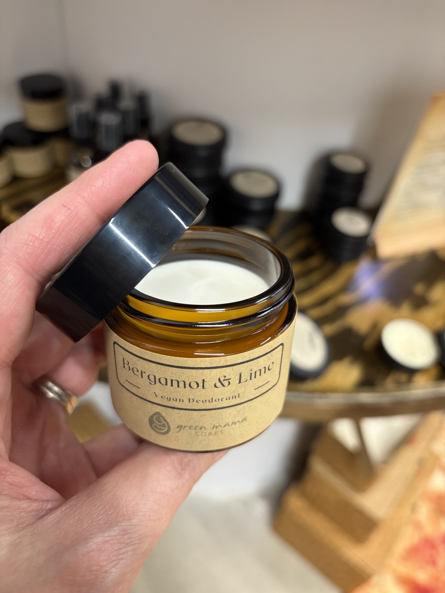 Packaged in a 2 ounce apothecary-style glass jar, it’s designed for a simple scoop-and-schmear application. Just use clean fingers to apply a small amount and gently smooth onto underarms. The texture is soft and spreadable, yet holds up beautifully in warmer months and climates without melting like traditional stick deodorants.